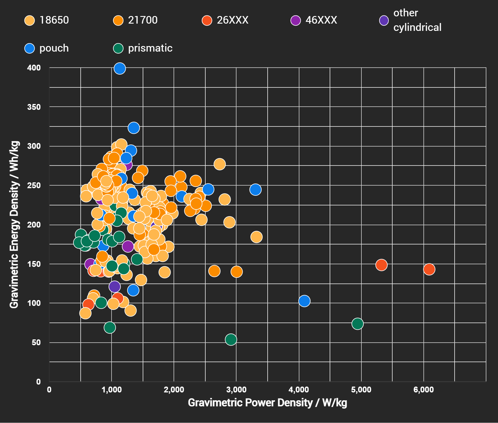 The INR2170-45D(B) from BAK’s full-tab 2170 cell series checks in at 248 Wh/kg and 2.12 kW/kg, while the EVE Energy 21700 40PL is designed towards even more power: With 233 Wh/kg and 2.35 kW/kg, the 40PL extends the technology front of 21700 cells in the Batemo Cell Explorer.