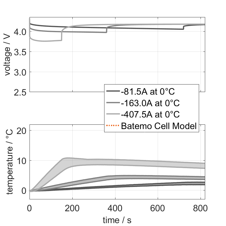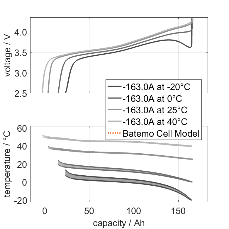 锂离子 Sunwoda 163 Ah 电池的 Batemo 电池模型是一个高精度的物理电池模型,具有全局有效性。作为一个数字孪生模型,它可通过模拟将您的决策无缝集成到您的研究、开发和电池分析中。有关巴特莫电池模型的特性和功能的详细信息,请参见 详情。Batemo 通过比较以下范围内的电池模拟和测量数据,证明了 Batemo 电池模型的准确性和有效性。验证范围广泛,实验特征涵盖电池的整个运行区域: 在低温和高温、最大电流和整个充电状态范围内。