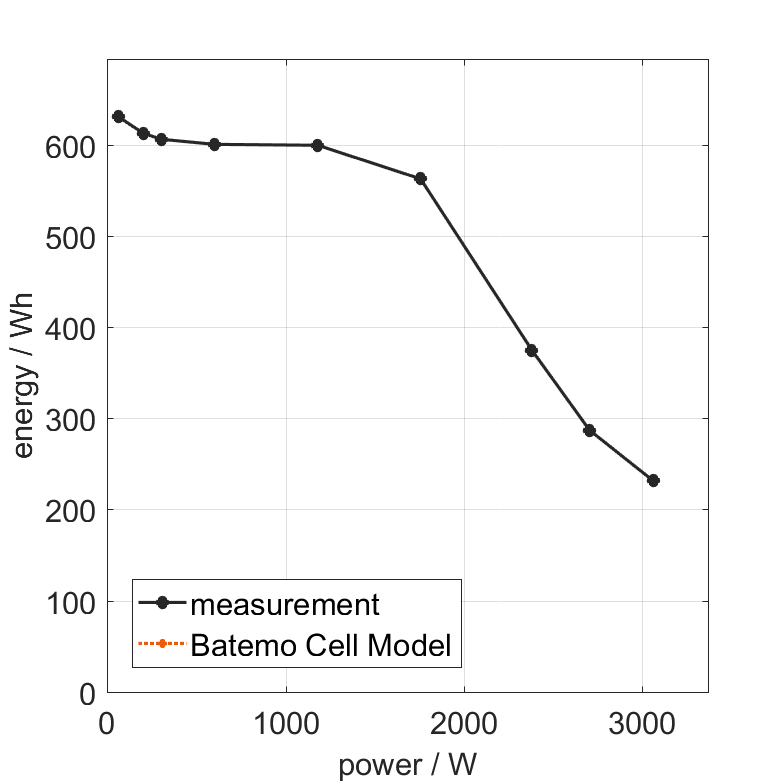 电池单元在 25°C 下以不同的恒定电流从 100% SOC 放电。热边界条件为自由对流。当电压达到 2.5V 或表面温度达到 60°C 时,测量停止。图表显示了实验的交换能量和平均功率。