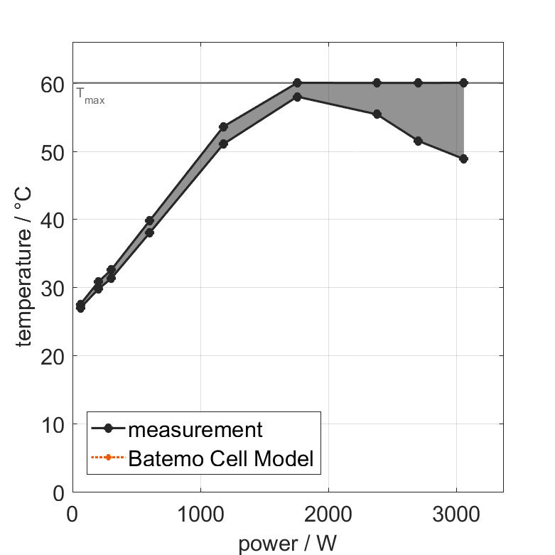 电池单元在 25°C 下以不同的恒定电流从 100% SOC 放电。热边界条件为自由对流。当电压达到 2.5V 或表面温度达到 60°C 时,测量停止。图表显示了实验结束时电池单元的表面温度和导出的平均功率。