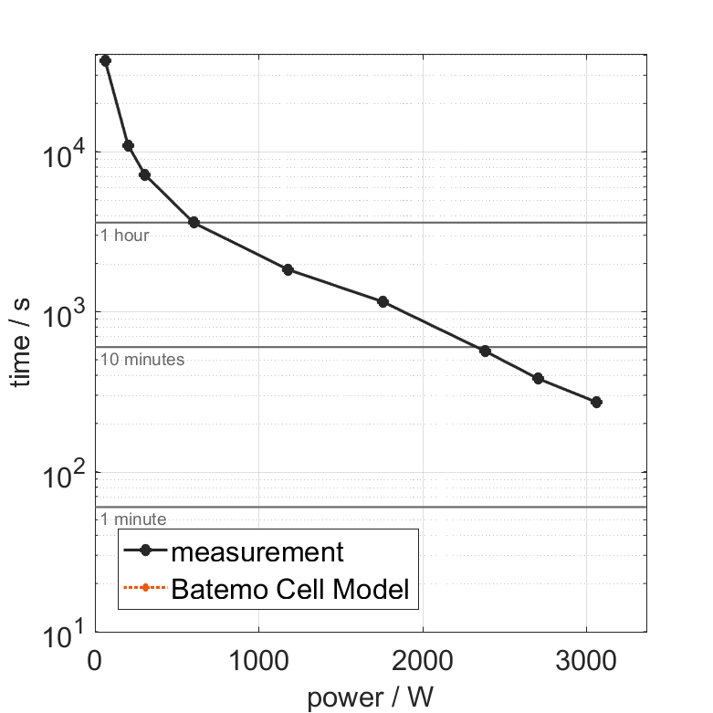 电池单元在 25°C 下以不同的恒定电流从 100% SOC 放电。热边界条件为自由对流。当电压达到 2.5V 或表面温度达到 60°C 时,测量停止。图表显示了实验的持续时间和平均功率。