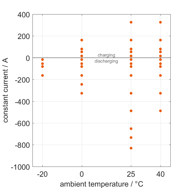 电池在各种环境温度下,通过不同的恒定电流从 100% SOC 放电或从 0% SOC 充电。热边界条件为自然对流。测量会在电压达到 2.5V 或 4.35V 或表面温度达到 60°C 时停止。图表显示了在哪些环境温度和恒定电流下可以进行测量。
