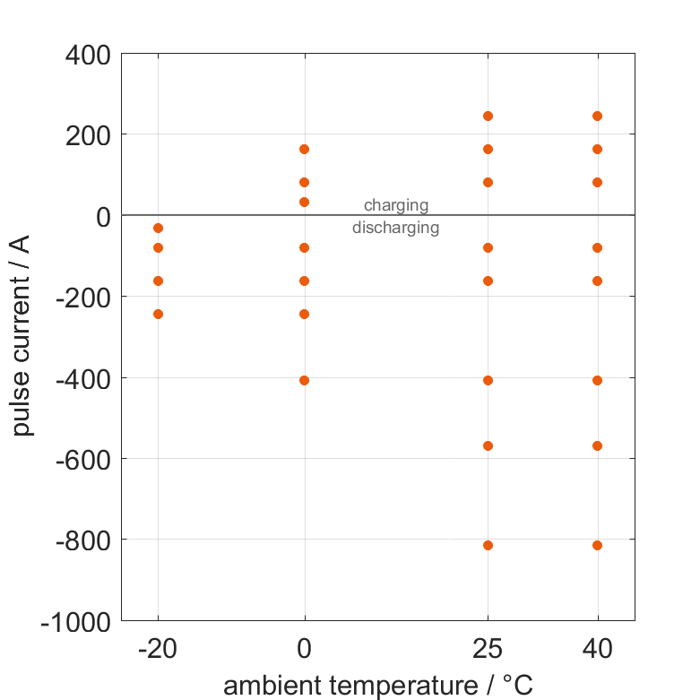 电池在各种环境温度下,经过无负载阶段后通过电流脉冲从 100% SOC 放电或从 0% SOC 充电。热边界条件为自然对流。测量会在电压达到 2.5V 或 4.35V 或表面温度达到 60°C 时停止。图表显示了在哪些环境温度和脉冲电流下可以进行测量。