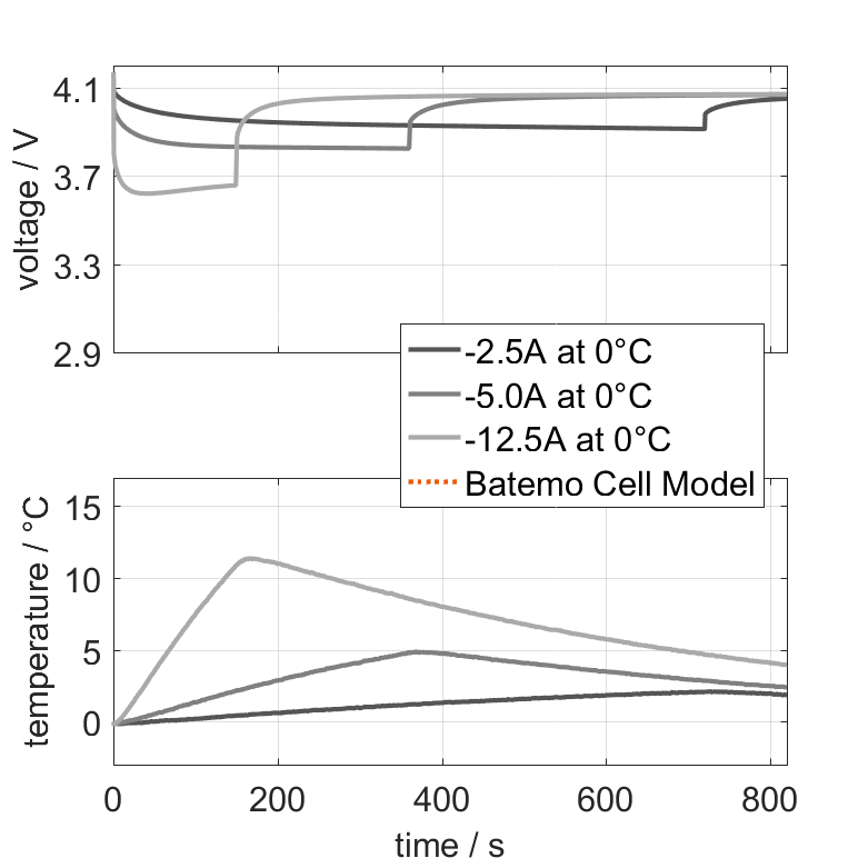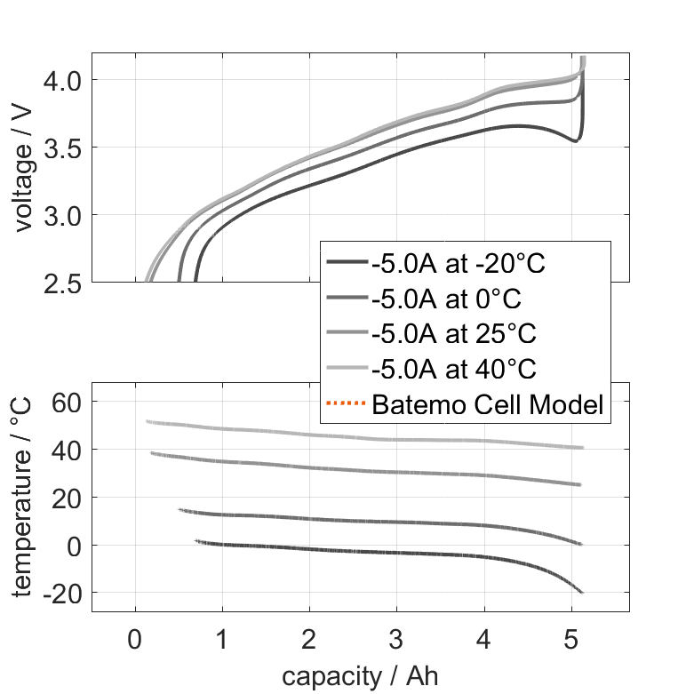 锂离子 Tenpower INR21700-50SG(C) 电池的 Batemo 电池模型是一个高精度的物理电池模型,具有全局有效性。作为一个数字孪生模型,它可通过模拟将您的决策无缝集成到您的研究、开发和电池分析中。有关巴特莫电池模型的特性和功能的详细信息,请参见 详情。Batemo 通过比较以下范围内的电池模拟和测量数据,证明了 Batemo 电池模型的准确性和有效性。验证范围广泛,实验特征涵盖电池的整个运行区域: 在低温和高温、最大电流和整个充电状态范围内。