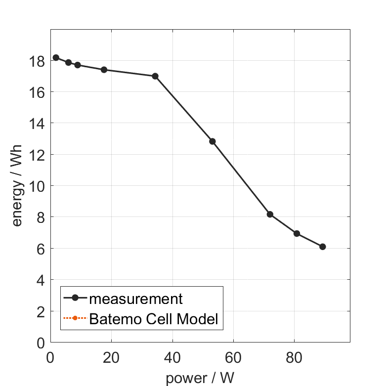 巴特莫测量了在25°C环境温度下,从100%充电状态用恒定电流0.5A (0.1C) 放电直到达到2.5V的C/10能量。热边界条件为自然对流。 |