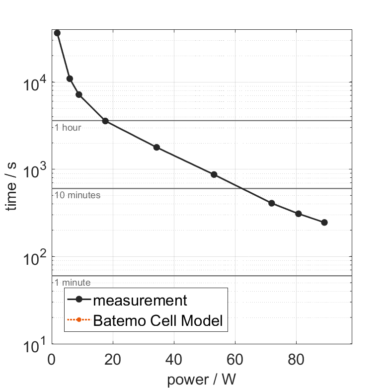 所有数据均来自巴特莫电池实验室的测量结果。 连续电流是完全放电而不使电池过热的最高电流。因此,电池在25°C的环境温度下从100%的充电状态(SOC)开始,以恒定电流放电,直到剩余充电状态降至10%或达到下限电压限制2.5V,或最大表面温度的90%(54°C)。 峰值电流是电池能够在5分钟内提供的电流。因此,电池在25°C的环境温度下从100% SOC开始,以恒定电流放电,直到5分钟后达到下限电压限制2.5V或最大表面温度60°C。对于达到最大表面温度的电池,测量的电流直接作为峰值电流。对于在5分钟后未达到最大表面温度但首先达到下限电压限制的电池,测量的电流会乘以一个修正系数,以估计在5分钟内会将电池加热到最大表面温度的电流。 热边界条件为自然对流。这些操作条件可能超出电池制造商的规格。 |