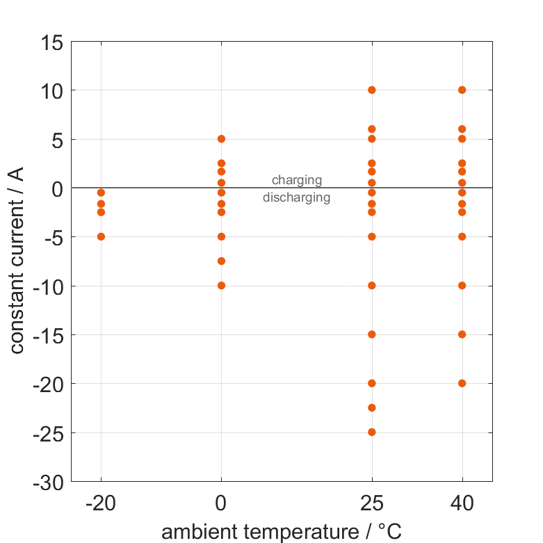 电池在各种环境温度下,通过不同的恒定电流从 100% SOC 放电或从 0% SOC 充电。热边界条件为自然对流。测量会在电压达到 2.5V 或 4.2V 或表面温度达到 60°C 时停止。图表显示了在哪些环境温度和恒定电流下可以进行测量。