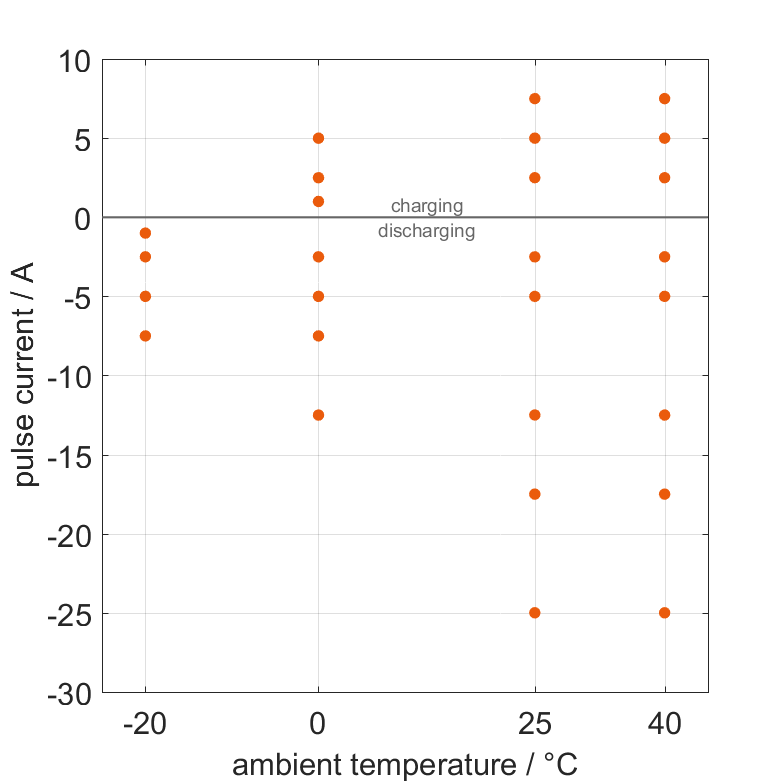 电池在各种环境温度下,经过无负载阶段后通过电流脉冲从 100% SOC 放电或从 0% SOC 充电。热边界条件为自然对流。测量会在电压达到 2.5V 或 4.2V 或表面温度达到 60°C 时停止。图表显示了在哪些环境温度和脉冲电流下可以进行测量。