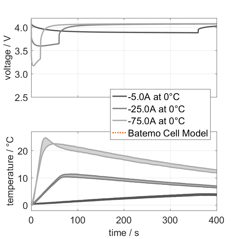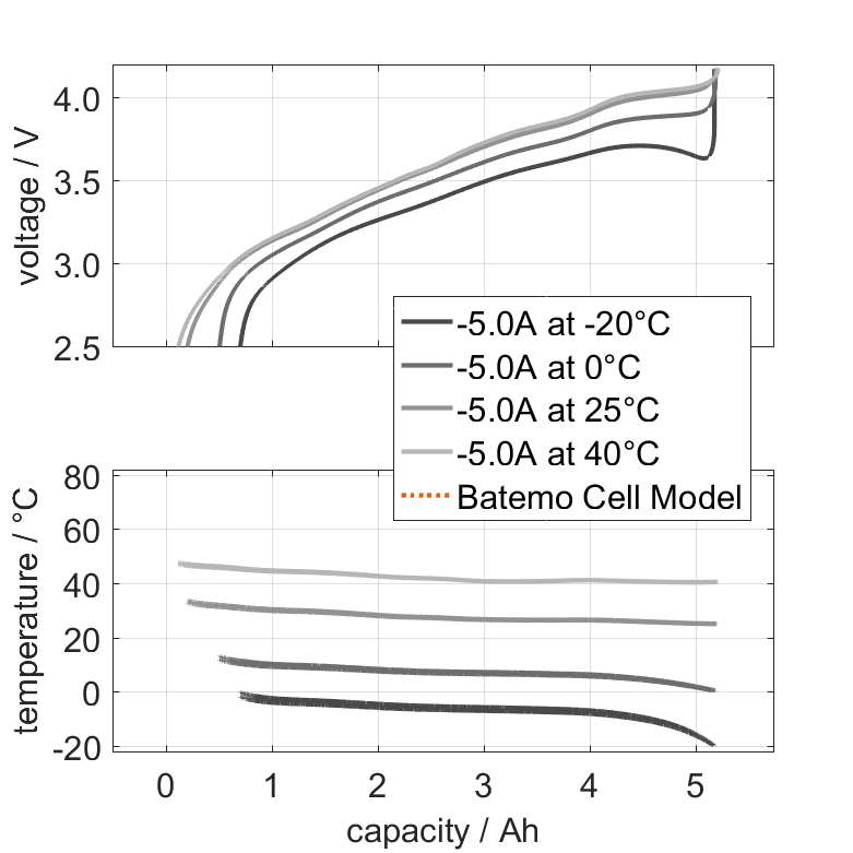 锂离子 Tenpower INR21700-50XG 电池的 Batemo 电池模型是一个高精度的物理电池模型,具有全局有效性。作为一个数字孪生模型,它可通过模拟将您的决策无缝集成到您的研究、开发和电池分析中。有关巴特莫电池模型的特性和功能的详细信息,请参见 详情。Batemo 通过比较以下范围内的电池模拟和测量数据,证明了 Batemo 电池模型的准确性和有效性。验证范围广泛,实验特征涵盖电池的整个运行区域: 在低温和高温、最大电流和整个充电状态范围内。