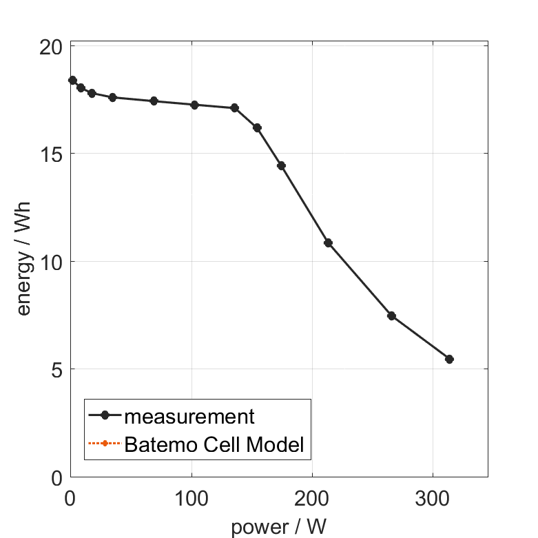 电池单元在 25°C 下以不同的恒定电流从 100% SOC 放电。热边界条件为自由对流。当电压达到 2.5V 或表面温度达到 80°C 时,测量停止。图表显示了实验的交换能量和平均功率。