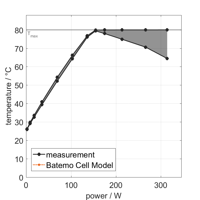 电池单元在 25°C 下以不同的恒定电流从 100% SOC 放电。热边界条件为自由对流。当电压达到 2.5V 或表面温度达到 80°C 时,测量停止。图表显示了实验结束时电池单元的表面温度和导出的平均功率。