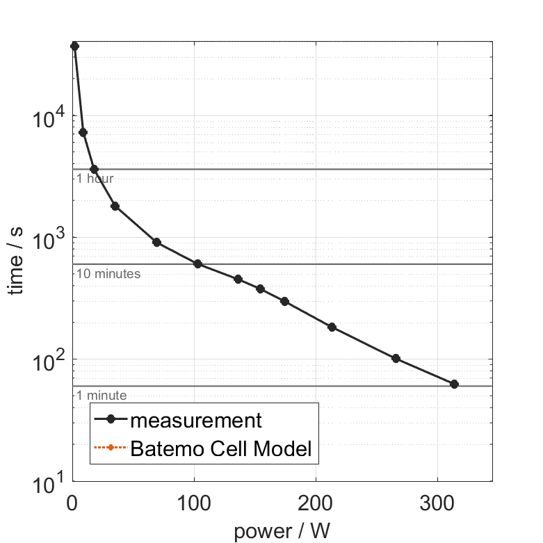 电池单元在 25°C 下以不同的恒定电流从 100% SOC 放电。热边界条件为自由对流。当电压达到 2.5V 或表面温度达到 80°C 时,测量停止。图表显示了实验的持续时间和平均功率。