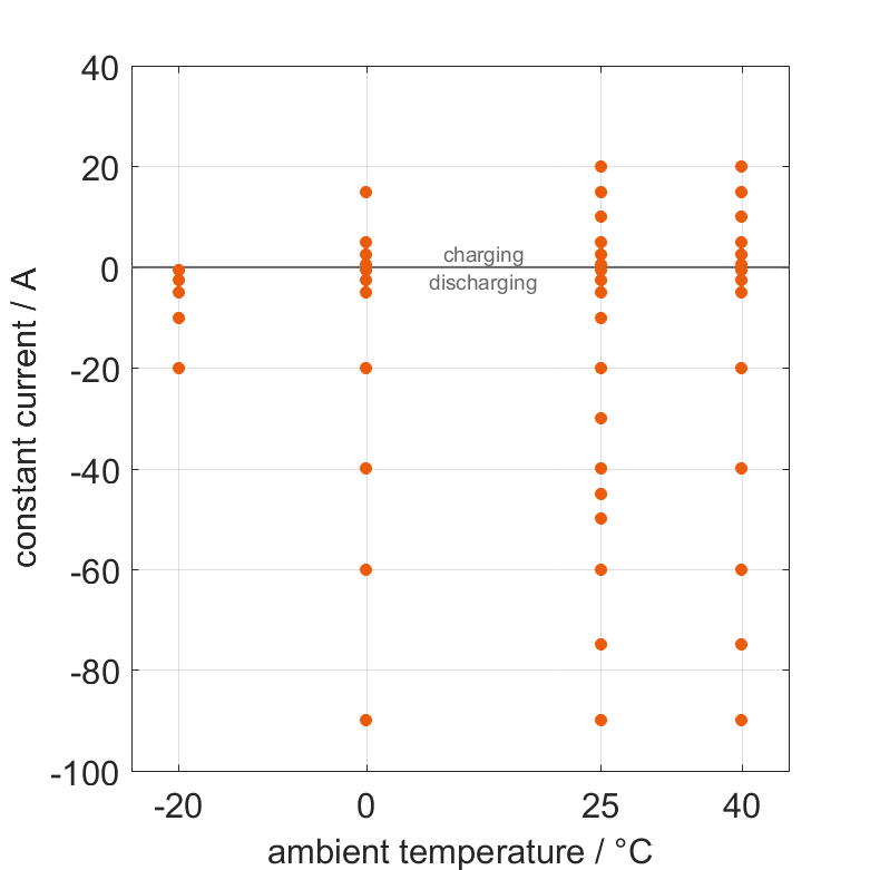 电池在各种环境温度下,通过不同的恒定电流从 100% SOC 放电或从 0% SOC 充电。热边界条件为自然对流。测量会在电压达到 2.5V 或 4.2V 或表面温度达到 80°C 时停止。图表显示了在哪些环境温度和恒定电流下可以进行测量。