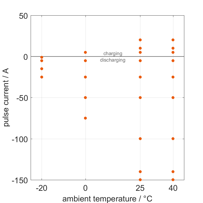 电池在各种环境温度下,经过无负载阶段后通过电流脉冲从 100% SOC 放电或从 0% SOC 充电。热边界条件为自然对流。测量会在电压达到 2.5V 或 4.2V 或表面温度达到 80°C 时停止。图表显示了在哪些环境温度和脉冲电流下可以进行测量。