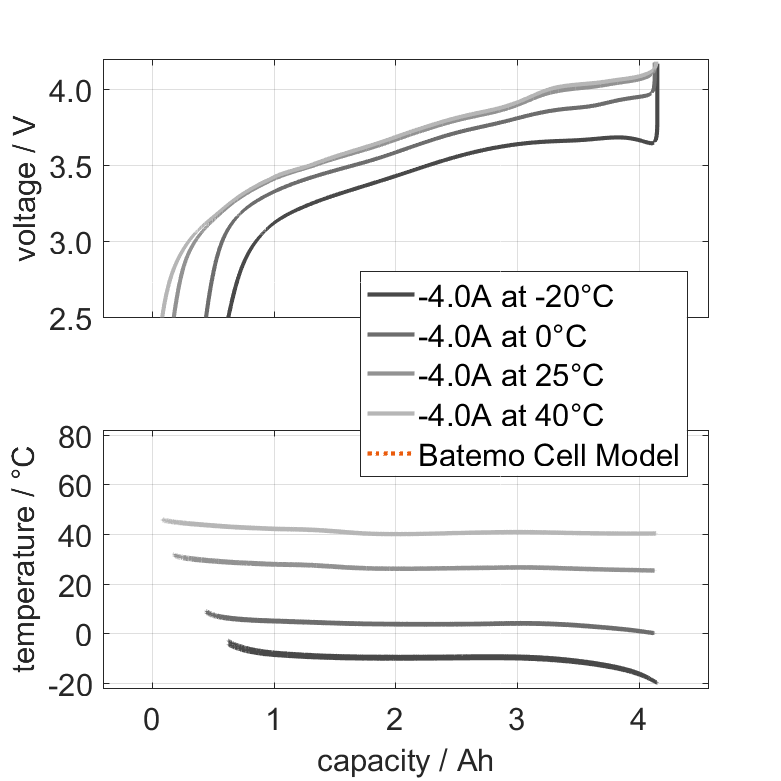 Das Batemo Cell Model der Lithium-Ion Batte­rie­zelle BAK Battery INR2170-40D ist ein hochprä­zises, physi­ka­li­sches Zellmo­dell mit globaler Validität. Als digitaler Zwilling integriert es sich nahtlos in Ihre Forschung, Entwick­lung und Analytik, indem es Ihre Entschei­dungen auf Simula­tionen stützt. Weitere Infor­ma­tionen zu den Funktionen und Fähig­keiten des Batemo Cell Models finden Sie unter Details. Batemo demons­triert die Genau­ig­keit und Validität des Batemo Cell Models durch den Vergleich von Batte­rie­si­mu­la­tion und Messdaten im unten angege­benen Bereich. Die Validie­rung ist umfang­reich, die experi­men­telle Charak­te­ri­sie­rung deckt den gesamten Betriebs­be­reich der Zelle ab: Bei niedrigen und hohen Tempe­ra­turen, bis zum maximalen Strom und im gesamten Ladezustandsbereich.