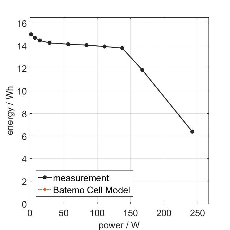 Die Zelle wird von 100% SOC mit unter­schied­li­chen Konstant­strömen bei 25°C entladen. Die thermi­sche Randbe­din­gung ist freie Konvek­tion. Die Messung endet, wenn entweder die Spannung von 2,5V oder die Oberflä­chen­tem­pe­ratur von 80°C erreicht wird. Der Graph zeigt die ausge­tauschte Energie und die mittlere Batte­rie­leis­tung während des Experiments.