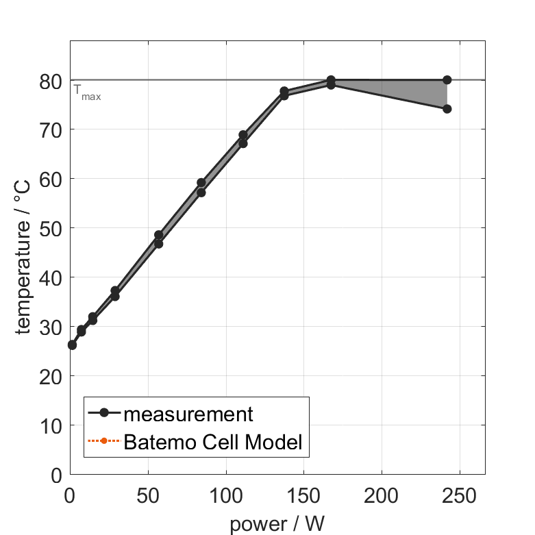 Die Zelle wird von 100% SOC mit unter­schied­li­chen Konstant­strömen bei 25°C entladen. Die thermi­sche Randbe­din­gung ist freie Konvek­tion. Die Messung endet, wenn entweder die Spannung von 2,5V oder die Oberflä­chen­tem­pe­ratur von 80°C erreicht wird. Der Graph zeigt die Oberflä­chen­tem­pe­ratur der Zelle am Versuchs­ende und die mittlere Batte­rie­leis­tung während des Experiments.