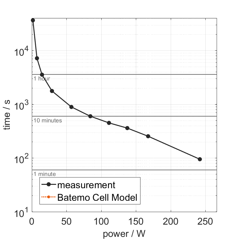 Die Zelle wird von 100% SOC mit unter­schied­li­chen Konstant­strömen bei 25°C entladen. Die thermi­sche Randbe­din­gung ist freie Konvek­tion. Die Messung endet, wenn entweder die Spannung von 2,5V oder die Oberflä­chen­tem­pe­ratur von 80°C erreicht wird. Der Graph zeigt die Versuchs­dauer und die mittlere Batte­rie­leis­tung während des Experiments.