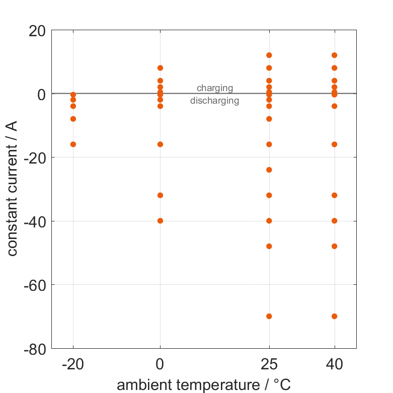 Die Zelle wird bei unter­schied­li­chen Umgebungs­tem­pe­ra­turen mit unter­schied­li­chen Konstant­strömen von 100% SOC entladen oder von 0% SOC geladen. Die thermi­sche Randbe­din­gung ist freie Konvek­tion. Die Messung stoppt, wenn entweder die Spannung von 2,5V oder 4,2V oder die Oberflä­chen­tem­pe­ratur von 80°C erreicht wird. Das Diagramm zeigt, bei welchen Umgebungs­tem­pe­ra­turen und Konstant­strömen Messungen verfügbar sind.