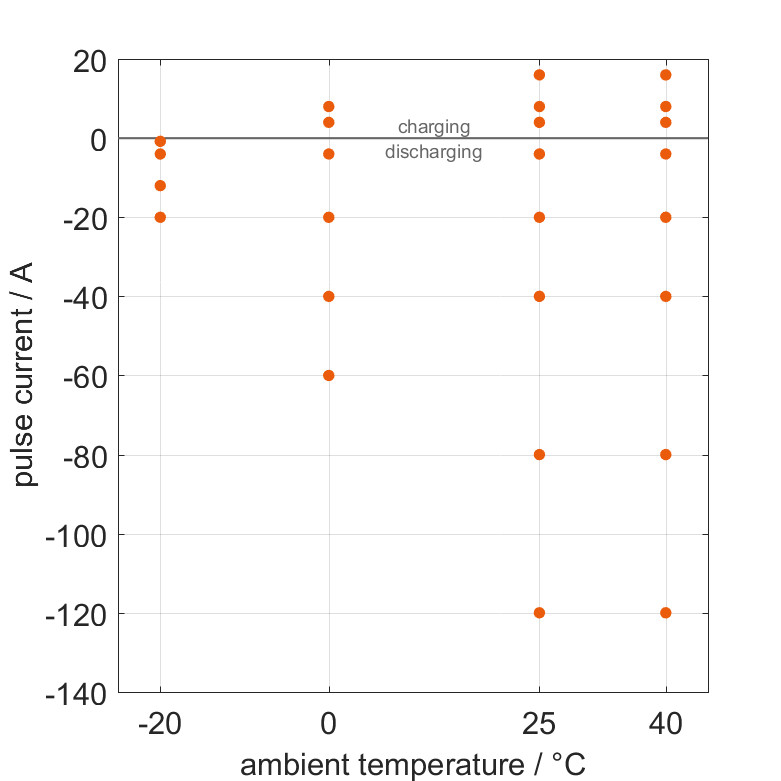 Die Zelle wird bei unter­schied­li­chen Umgebungs­tem­pe­ra­turen mit Strom­pulsen, gefolgt von Lastphasen, von 100% SOC entladen oder von 0% SOC geladen. Die thermi­sche Randbe­din­gung ist freie Konvek­tion. Die Messung stoppt, wenn entweder die Spannung von 2,5V oder 4,2V oder die Oberflä­chen­tem­pe­ratur von 80°C erreicht wird. Das Diagramm zeigt, bei welchen Umgebungs­tem­pe­ra­turen und Pulsen Messungen verfügbar sind.