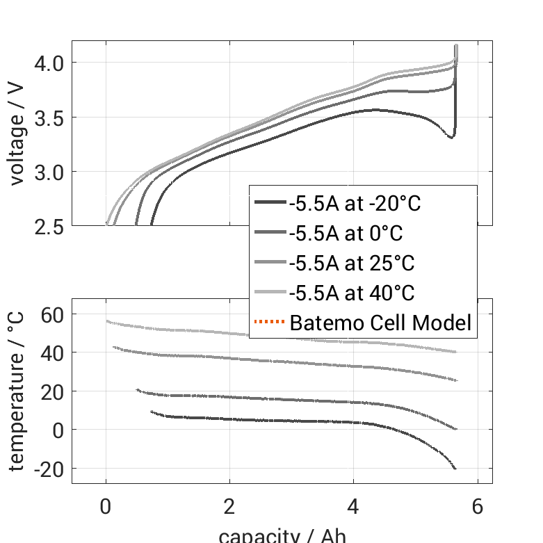 Das Batemo Cell Model der Lithium-Ion Batteriezelle Far East Battery (FEB) 21700-5500mAh ist ein hochpräzises, physikalisches Zellmodell mit globaler Validität. Als digitaler Zwilling integriert es sich nahtlos in Ihre Forschung, Entwicklung und Analytik, indem es Ihre Entscheidungen auf Simulationen stützt. Weitere Informationen zu den Funktionen und Fähigkeiten des Batemo Cell Models finden Sie unter Details. Batemo demonstriert die Genauigkeit und Validität des Batemo Cell Models durch den Vergleich von Batteriesimulation und Messdaten im unten angegebenen Bereich. Die Validierung ist umfangreich, die experimentelle Charakterisierung deckt den gesamten Betriebsbereich der Zelle ab: Bei niedrigen und hohen Temperaturen, bis zum maximalen Strom und im gesamten Ladezustandsbereich.