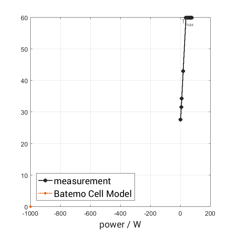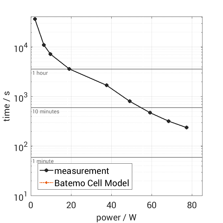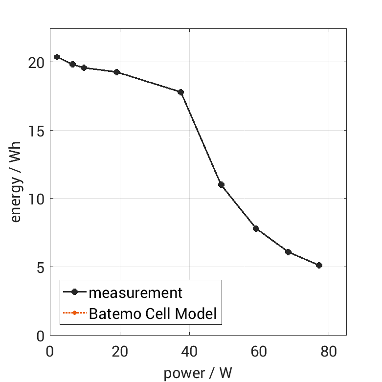 Die kontinuierliche Leistung ist die höchste Leistung, die die Zelle vollständig entlädt, ohne sie zu überhitzen. Daher wird die Zelle von 100% Ladezustand (SOC) bei einer Umgebungstemperatur von 25°C mit konstantem Strom bis zu einem Rest-Ladezustand von 10% und entweder der unteren Spannungsgrenze von 2,5V oder 90% der maximalen Oberflächentemperatur ( 54°C) entladen. Die Spitzenleistung ist die Leistung, die die Zelle 5 Minuten lang liefern kann. Daher wird die Zelle von 100% SOC bei einer Umgebungstemperatur von 25°C mit konstantem Strom entladen, bis sie entweder die untere Spannungsgrenze von 2,5V oder die maximale Oberflächentemperatur von 60°C nach 5 Minuten erreicht. Für Zellen, die die maximale Temperaturgrenze erreichen, wird die gemessene Leistung direkt als Spitzenleistung übernommen. Für Zellen, die nach 5 Minuten nicht die maximale Oberflächentemperatur erreichen, weil sie zuerst die untere Spannungsgrenze erreichen, wird die gemessene Leistung mit einem Korrekturfaktor multipliziert, der die Leistung abschätzt, die die Zelle innerhalb von 5 Minuten auf die maximale Oberflächentemperatur erhitzt hätte. Die thermische Randbedingung ist freie Konvektion. Diese Betriebsbedingungen können außerhalb der Spezifikation des Zellherstellers liegen. |