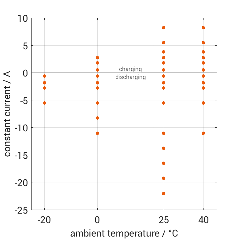 Die Zelle wird bei unterschiedlichen Umgebungstemperaturen mit unterschiedlichen Konstantströmen von 100% SOC entladen oder von 0% SOC geladen. Die thermische Randbedingung ist freie Konvektion. Die Messung stoppt, wenn entweder die Spannung von 2,5V oder 4,2V oder die Oberflächentemperatur von 60°C erreicht wird. Das Diagramm zeigt, bei welchen Umgebungstemperaturen und Konstantströmen Messungen verfügbar sind.