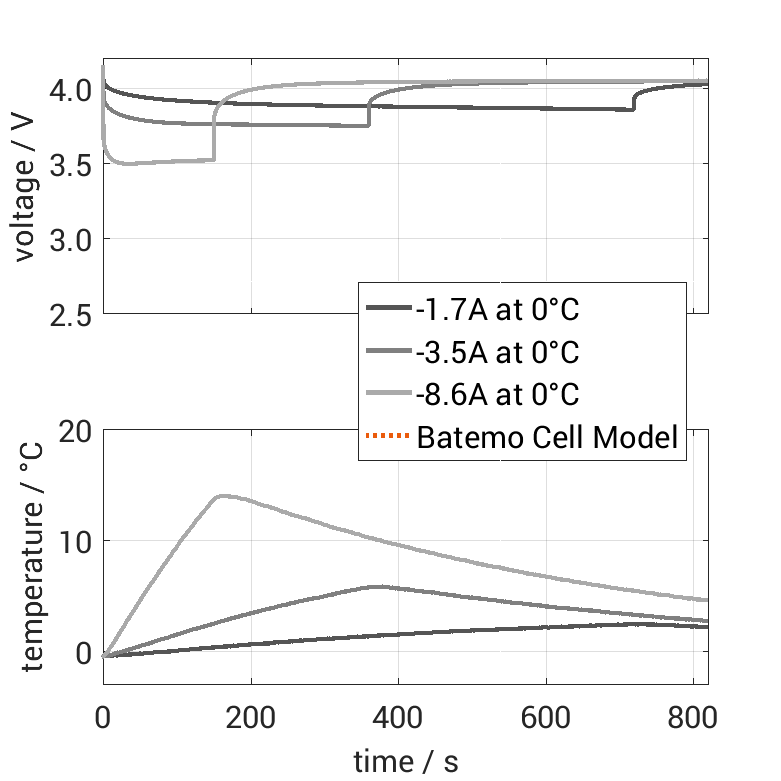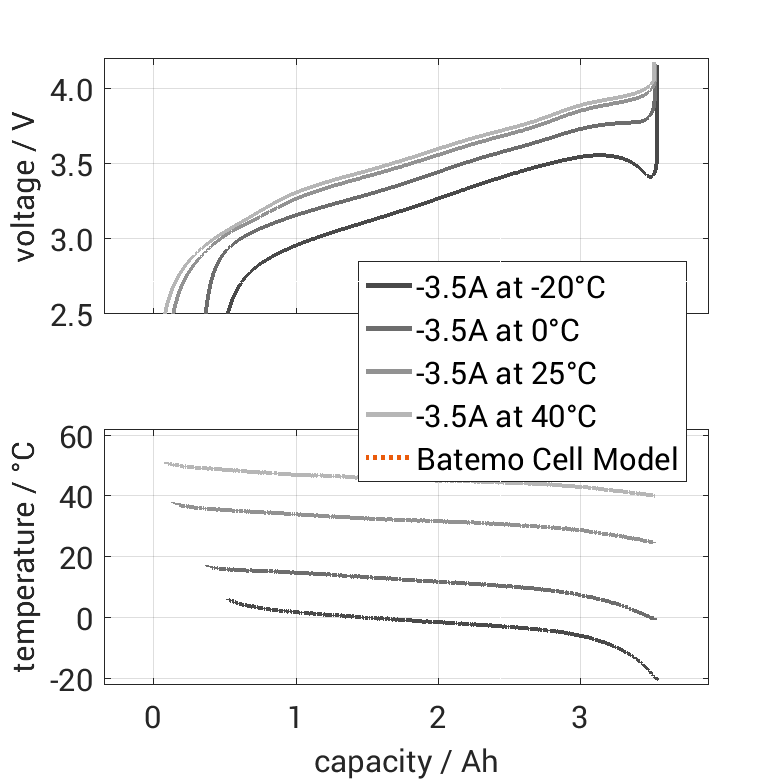 Das Batemo Cell Model der Lithium-Ion Batte­rie­zelle Molicel INR-18650-M35A(2) ist ein hochprä­zises, physi­ka­li­sches Zellmo­dell mit globaler Validität. Als digitaler Zwilling integriert es sich nahtlos in Ihre Forschung, Entwick­lung und Analytik, indem es Ihre Entschei­dungen auf Simula­tionen stützt. Weitere Infor­ma­tionen zu den Funktionen und Fähig­keiten des Batemo Cell Models finden Sie unter Details. Batemo demons­triert die Genau­ig­keit und Validität des Batemo Cell Models durch den Vergleich von Batte­rie­si­mu­la­tion und Messdaten im unten angege­benen Bereich. Die Validie­rung ist umfang­reich, die experi­men­telle Charak­te­ri­sie­rung deckt den gesamten Betriebs­be­reich der Zelle ab: Bei niedrigen und hohen Tempe­ra­turen, bis zum maximalen Strom und im gesamten Ladezustandsbereich.