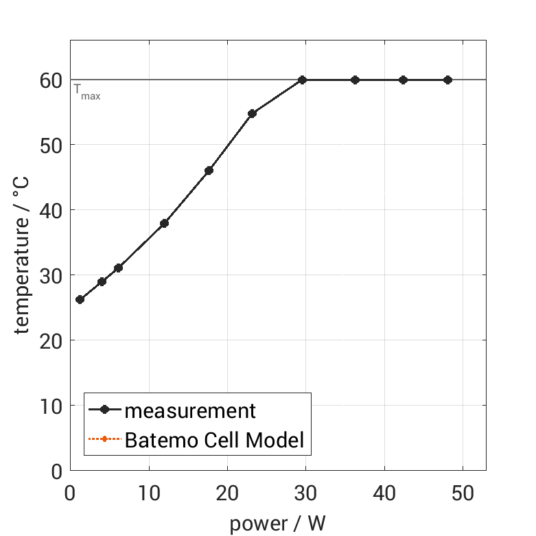 Die Zelle wird von 100% SOC mit unter­schied­li­chen Konstant­strömen bei 25°C entladen. Die thermi­sche Randbe­din­gung ist freie Konvek­tion. Die Messung endet, wenn entweder die Spannung von 2,5V oder die Oberflä­chen­tem­pe­ratur von 60°C erreicht wird. Der Graph zeigt die Oberflä­chen­tem­pe­ratur der Zelle am Versuchs­ende und die mittlere Batte­rie­leis­tung während des Experiments.