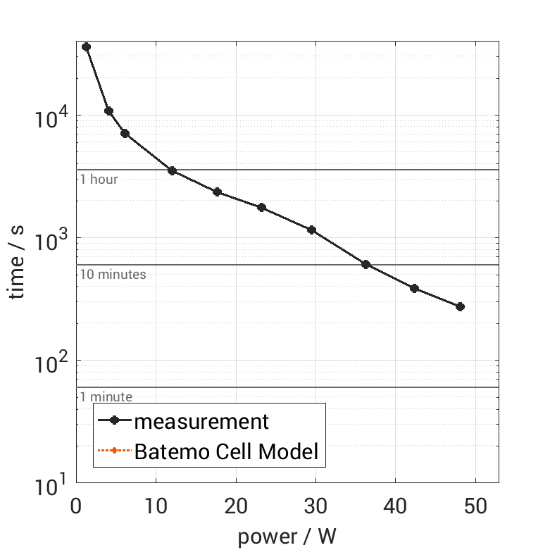 Die Zelle wird von 100% SOC mit unter­schied­li­chen Konstant­strömen bei 25°C entladen. Die thermi­sche Randbe­din­gung ist freie Konvek­tion. Die Messung endet, wenn entweder die Spannung von 2,5V oder die Oberflä­chen­tem­pe­ratur von 60°C erreicht wird. Der Graph zeigt die Versuchs­dauer und die mittlere Batte­rie­leis­tung während des Experiments.