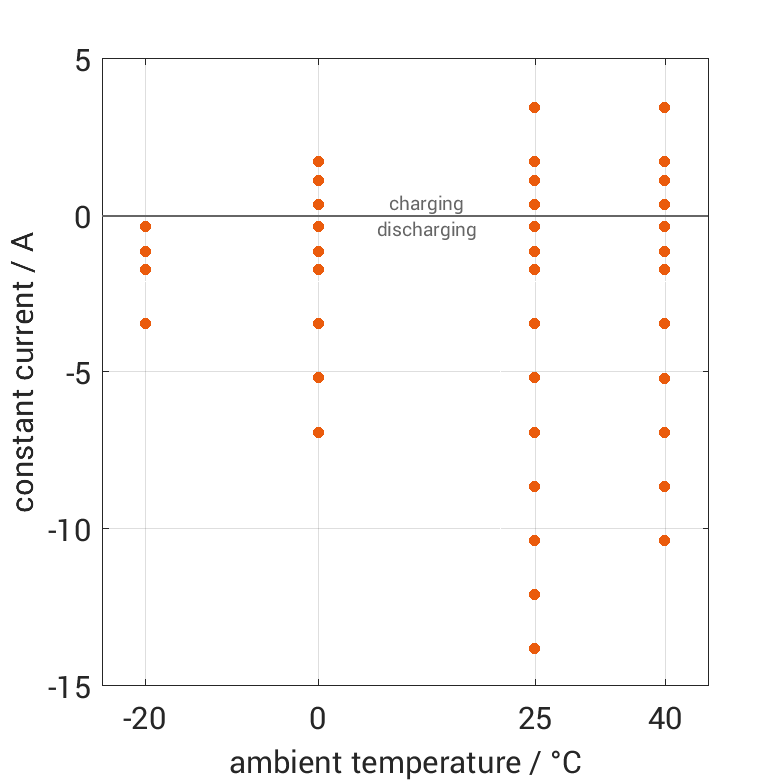 Die Zelle wird bei unter­schied­li­chen Umgebungs­tem­pe­ra­turen mit unter­schied­li­chen Konstant­strömen von 100% SOC entladen oder von 0% SOC geladen. Die thermi­sche Randbe­din­gung ist freie Konvek­tion. Die Messung stoppt, wenn entweder die Spannung von 2,5V oder 4,2V oder die Oberflä­chen­tem­pe­ratur von 60°C erreicht wird. Das Diagramm zeigt, bei welchen Umgebungs­tem­pe­ra­turen und Konstant­strömen Messungen verfügbar sind.