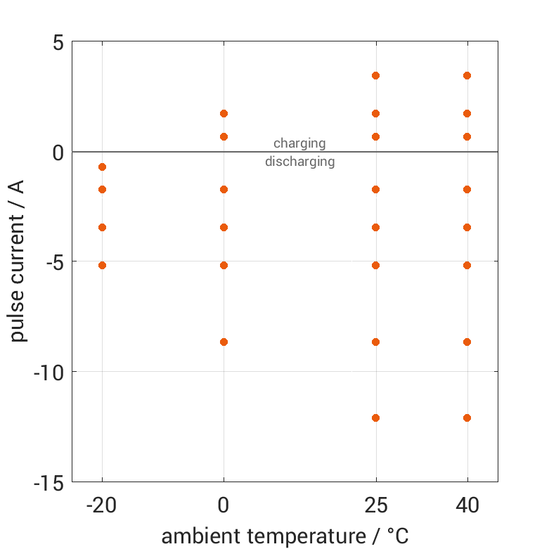 Die Zelle wird bei unter­schied­li­chen Umgebungs­tem­pe­ra­turen mit Strom­pulsen, gefolgt von Lastphasen, von 100% SOC entladen oder von 0% SOC geladen. Die thermi­sche Randbe­din­gung ist freie Konvek­tion. Die Messung stoppt, wenn entweder die Spannung von 2,5V oder 4,2V oder die Oberflä­chen­tem­pe­ratur von 60°C erreicht wird. Das Diagramm zeigt, bei welchen Umgebungs­tem­pe­ra­turen und Pulsen Messungen verfügbar sind.