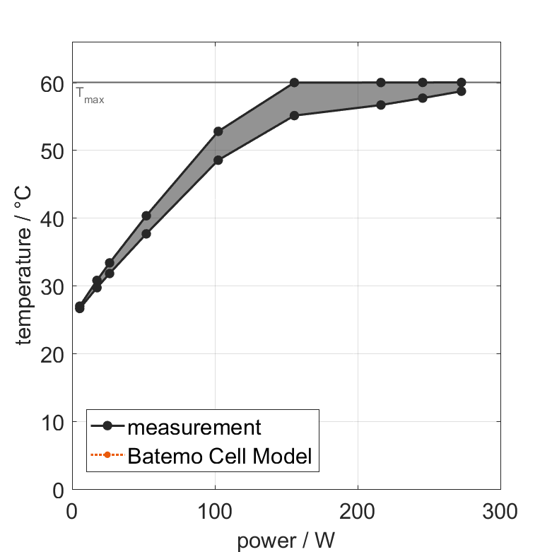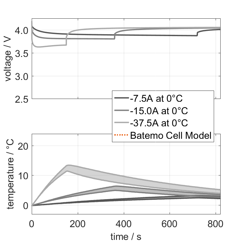リチウムイオンバッテリーセル Enpower Greentech XNP0150J のバテモ・セルモデルは、世界的に有効な高精度の物理セルモデルです。デジタルツインとして、シミュレーションに基づいて意思決定を行うことで、研究、開発、バッテリー分析にシームレスに統合できます。バテモ・セルモデルの特徴と機能については、詳細をご覧ください。バテモは、以下に示す範囲のバッテリーシミュレーションと測定データを比較することで、バテモ・セルモデルの精度と妥当性を実証しています。検証は広範囲に及び、低温から高温、最大電流まで、全充電状態範囲において実験的特性評価はセルの全動作領域をカバーしています。