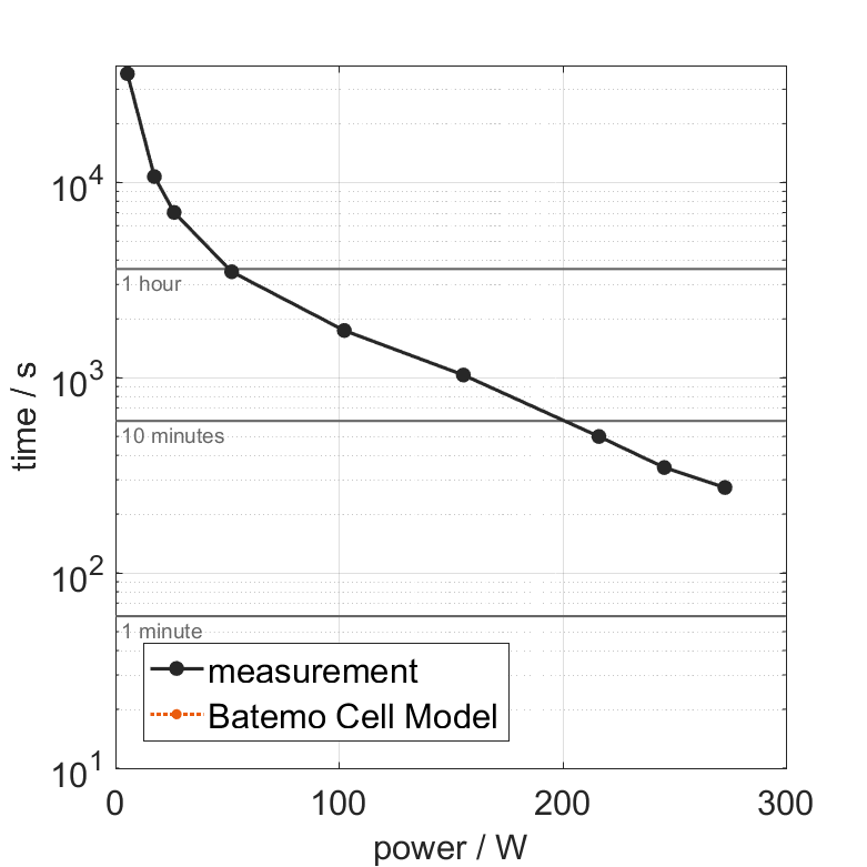 連続電力は、セルを過熱することなく完全に放電できる最大の電力です。したがって、セルは25°Cの周囲温度で100%の充電状態(SOC)から一定電流で放電され、残りの充電状態が10%になるまで、または下限電圧制限の 2.5V または最大表面温度の90%(54°C)に達するまで放電されます。 ピーク電力は、セルが5分間供給できる電力です。したがって、セルは25°Cの周囲温度で100%のSOCから一定電流で放電され、5分後に下限電圧制限の 2.5V または最大表面温度の 60°C のいずれかに達するまで放電されます。最大温度制限に達するセルの場合、測定された電力が直接ピーク電力として扱われます。最大表面温度に5分後に達しないが、先に下限電圧制限に達するセルの場合、測定された電力は補正係数で調整され、これにより5分以内にセルを最大表面温度まで加熱するであろう電力が推定されます。 熱的境界条件は自然対流です。これらの運転条件は、セルメーカーの仕様を超えている可能性があります。 |