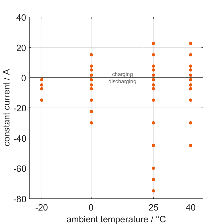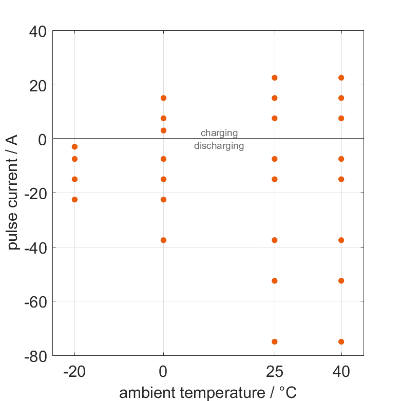 セルは、さまざまな環境温度で無負荷フェーズに続いて電流パルスで100% SOCから放電されるか、0% SOCから充電されます。熱境界条件は自由対流です。 測定は、電圧が 2.5Vまたは 4.25Vまたは表面温度が 60°Cに達すると停止します。 グラフは、どの環境温度とパルス電流で測定が利用可能かを示しています。