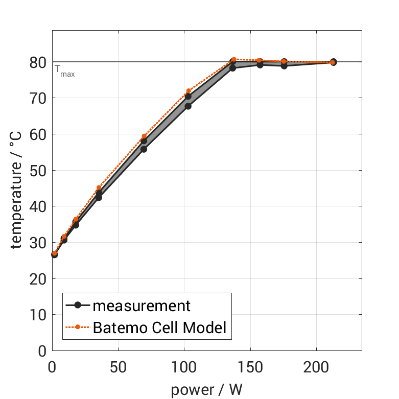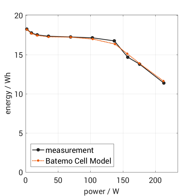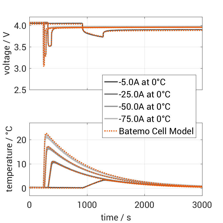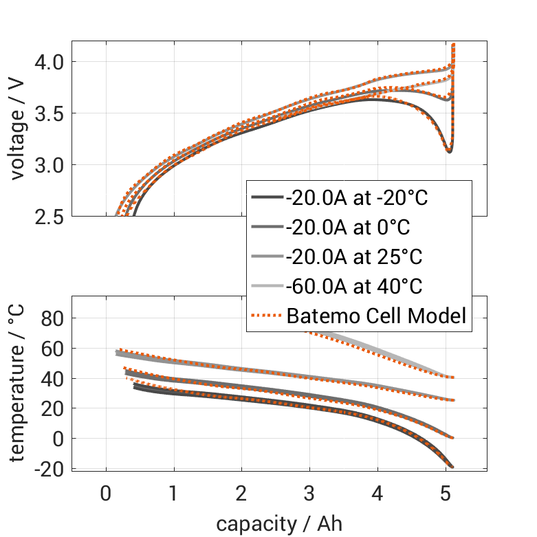 바테모는 아래에 제공된 범위에서 배터리 시뮬레이션 및 측정 데이터를 비교하여 바테모 셀 모델의 정확성과 유효성을 입증합니다. 검증은 광범위하며, 실험적 특성화는 셀의 전체 작동 영역을 다룹니다: 낮은 온도와 높은 온도에서, 최대 전류까지, 그리고 전체 충전 상태 범위에서.