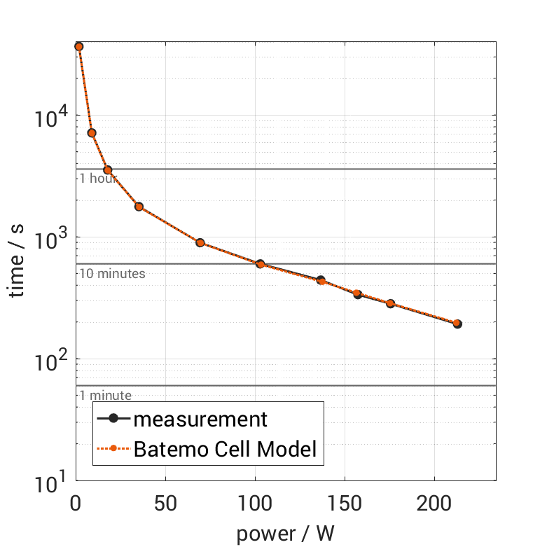 연속 전력은 셀을 과열하지 않고 완전히 방전할 수 있는 최대 전력입니다. 따라서 셀은 25°C의 주변 온도에서 100% 충전 상태(SOC)에서 일정 전류로 방전되며, 잔여 충전 상태가 10%가 될 때까지 또는 하한 전압 제한 2.5V 또는 최대 표면 온도 90% (72°C)에 도달할 때까지 방전됩니다. 피크 전력은 셀에서 5분 동안 공급할 수 있는 전력입니다. 따라서 셀은 25°C의 주변 온도에서 100% SOC에서 일정 전류로 방전되며, 5분 후 하한 전압 제한 2.5V 또는 최대 표면 온도 80°C에 도달할 때까지 방전됩니다. 최대 온도 제한에 도달한 셀의 경우, 측정된 전력이 직접 피크 전력으로 간주됩니다. 최대 표면 온도에 5분 후 도달하지 않고 하한 전압 제한에 먼저 도달한 셀의 경우, 측정된 전력은 보정 계수로 조정되며, 이를 통해 5분 이내에 셀을 최대 표면 온도까지 가열할 전력이 추정됩니다. 열적 경계 조건은 자연 대류입니다. 이러한 운영 조건은 셀 제조업체의 사양을 초과할 수 있습니다. |