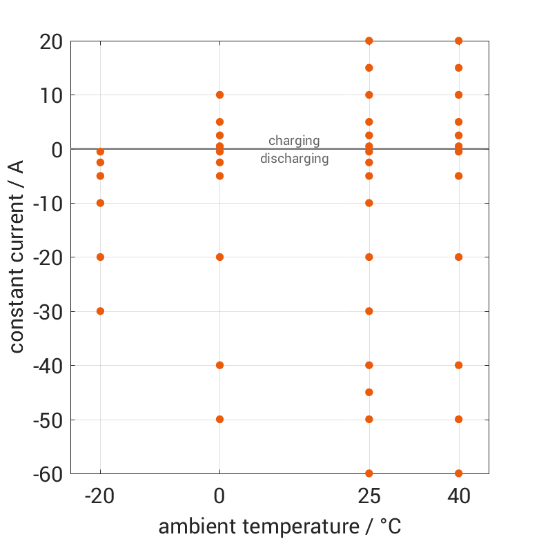 셀은 다양한 환경 온도에서 서로 다른 정전류로 100% SOC에서 방전되거나 0% SOC에서 충전됩니다. 열 경계 조건은 자유 대류입니다. 측정은 전압이 2.5V 또는 4.2V에 도달하거나 표면 온도가 80°C에 도달하면 중지됩니다. 그래프는 어떤 환경 온도와 정전류에서 측정이 가능한지 보여줍니다.
