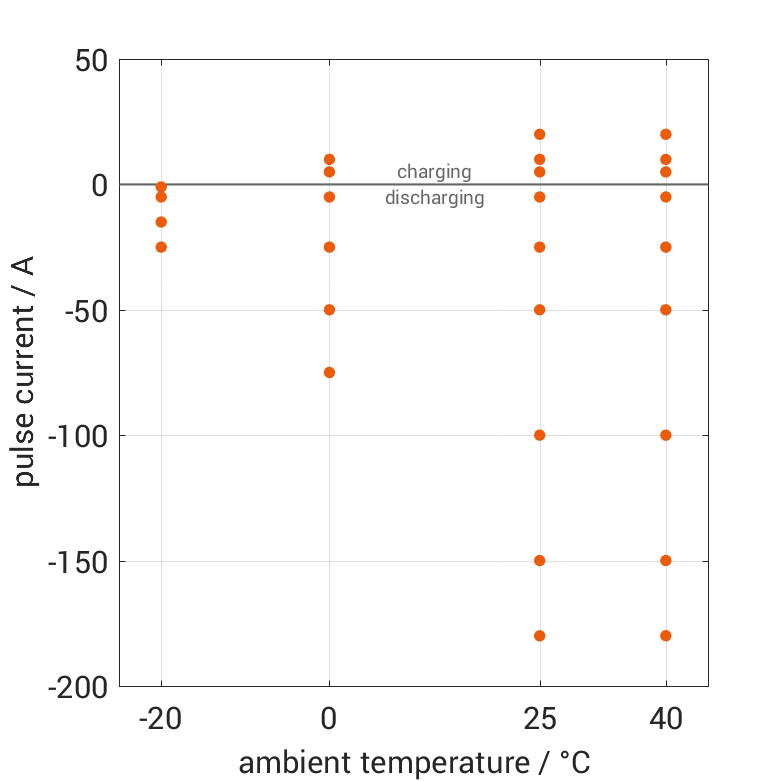 셀은 다양한 환경 온도에서 무부하 단계에 이어 전류 펄스으로 100% SOC에서 방전되거나 0% SOC에서 충전됩니다. 열 경계 조건은 자유 대류입니다. 측정은 전압이 2.5V 또는 4.2V에 도달하거나 표면 온도가 80°C에 도달하면 중지됩니다. 그래프는 어떤 환경 온도와 펄스 전류에서 측정이 가능한지 보여줍니다.