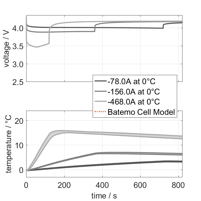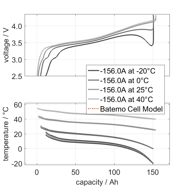 The Batemo Cell Model of the lithium-ion battery cell CATL 3.7V 156Ah NCM is a high-precision, physical cell model with global validity. As a digital twin it seamlessly integrates into your research, development and battery analytics by basing your decisions on simulations. See the details to learn more about the features and capabilities of the Batemo Cell Model. Batemo demonstrates the accuracy and validity of the Batemo Cell Model by comparing battery simulation and measurement data in the range given below. Validation is extensive, experimental characterization covers the total operational area of the cell: At low and high temperatures, up to the maximal current and in the whole state of charge range.