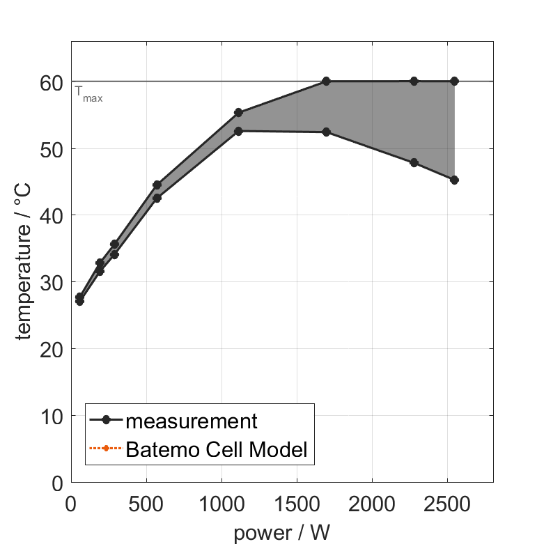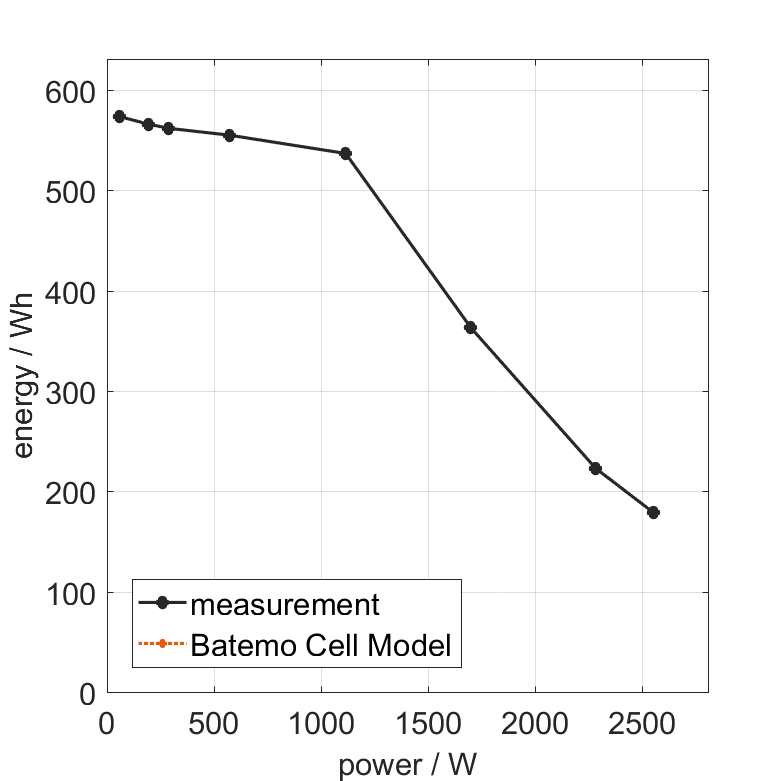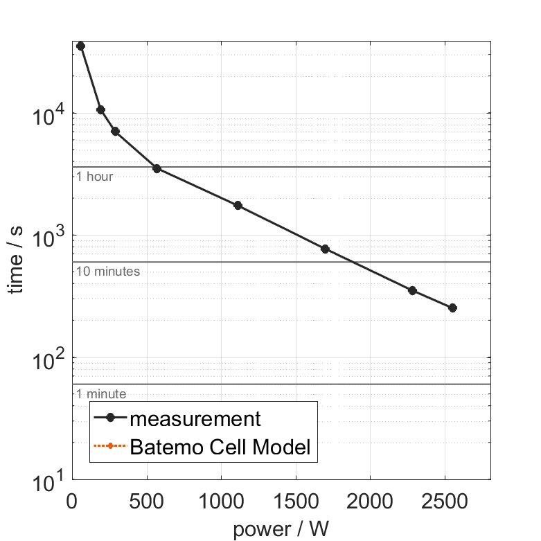 All quantities are measurement results from the Batemo battery laboratory. The continuous power is the highest power that completely discharges the cell without overheating it. Therefore, the cell is discharged from 100% state of charge (SOC) at an ambient temperature of 25°C with a constant current until a residual state of charge of 10% and either the lower voltage limit of 2.5V or 90% of the maximum surface temperature ( 54°C) is reached. The peak power is the power the cell can supply for 5 minutes. The cell is therefore discharged from 100% SOC at an ambient temperature of 25°C with a constant current until it reaches either the lower voltage limit of 2.5V or the maximum surface temperature of 60°C after 5 minutes. For cells that reach the maximum temperature limit, the measured power is directly taken as peak power. For cells that do not reach the maximum surface temperature after 5 minutes because they reach the lower voltage limit first, the measured power is multiplied by a correction factor that estimates the power that would have heated the cell to the maximum surface temperature within 5 minutes. The thermal boundary condition is free convection. These operating conditions may be outside the cell manufacturer’s specification. |