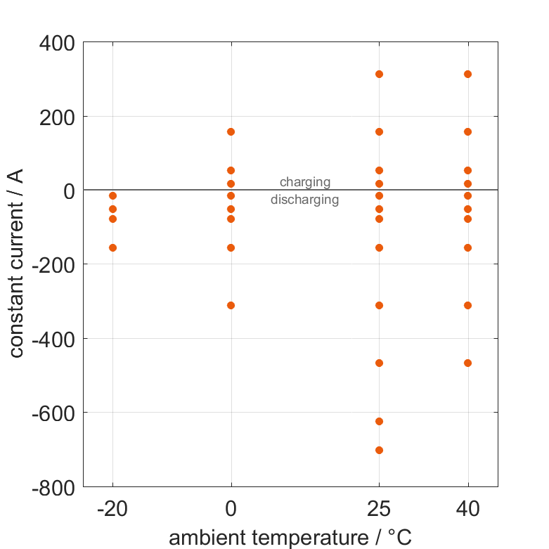 The cell is discharged from 100% SOC or charged from 0% SOC with different constant currents at different ambient temperatures. The thermal boundary condition is free convection. The measurement stops when reaching either the voltage of 2.5V or 4.35V or the surface temperature of 60°C. The graph shows for which ambient temperatures and charging and discharging constant currents measurements are available.