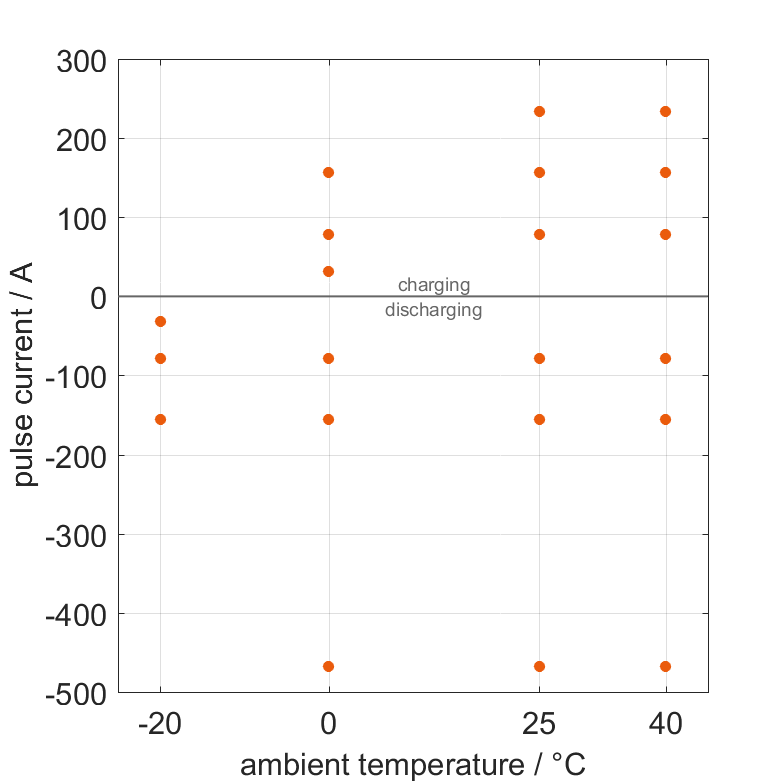 The cell is discharged from 100% SOC or charged from 0% SOC with current pulses followed by no-load phases at different ambient temperatures. The thermal boundary condition is free convection. The measurement stops when reaching either the voltage of 2.5V or 4.35V or the surface temperature of 60°C. The graph shows for which ambient temperatures and pulse currents measurements are available.
