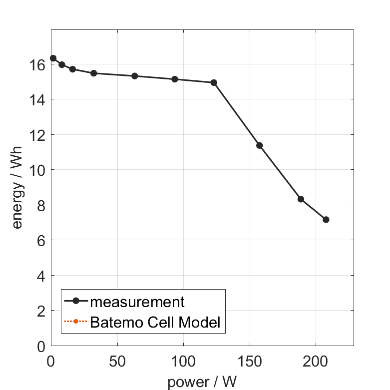 The cell is discharged from 100% SOC with different constant currents at 25°C. The thermal boundary condi­tion is free convec­tion. The measure­ment stops when reaching either the voltage of 2.5V or the surface temper­a­ture of 80°C. The graph shows the derived exchanged energy and average power of the experiment.