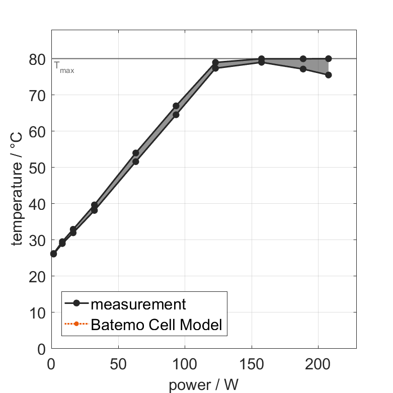 The cell is discharged from 100% SOC with different constant currents at 25°C. The thermal boundary condi­tion is free convec­tion. The measure­ment stops when reaching either the voltage of 2.5V or the surface temper­a­ture of 80°C. The graph shows the cell surface temper­a­ture at the end and the derived average power of the experiment.