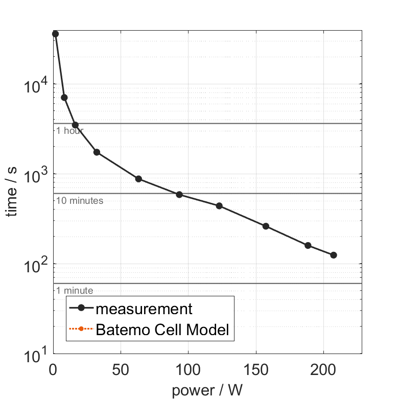 The cell is discharged from 100% SOC with different constant currents at 25°C. The thermal boundary condi­tion is free convec­tion. The measure­ment stops when reaching either the voltage of 2.5V or the surface temper­a­ture of 80°C. The graph shows the derived exper­i­ment duration and average power of the experiment.