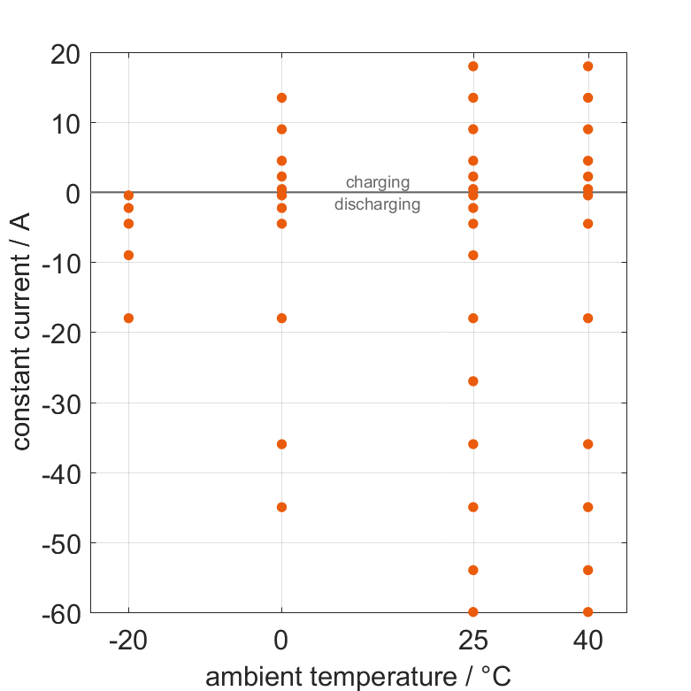The cell is discharged from 100% SOC or charged from 0% SOC with different constant currents at different ambient temper­a­tures. The thermal boundary condi­tion is free convec­tion. The measure­ment stops when reaching either the voltage of 2.5V or 4.2V or the surface temper­a­ture of 80°C. The graph shows for which ambient temper­a­tures and charging and discharging constant currents measure­ments are available.