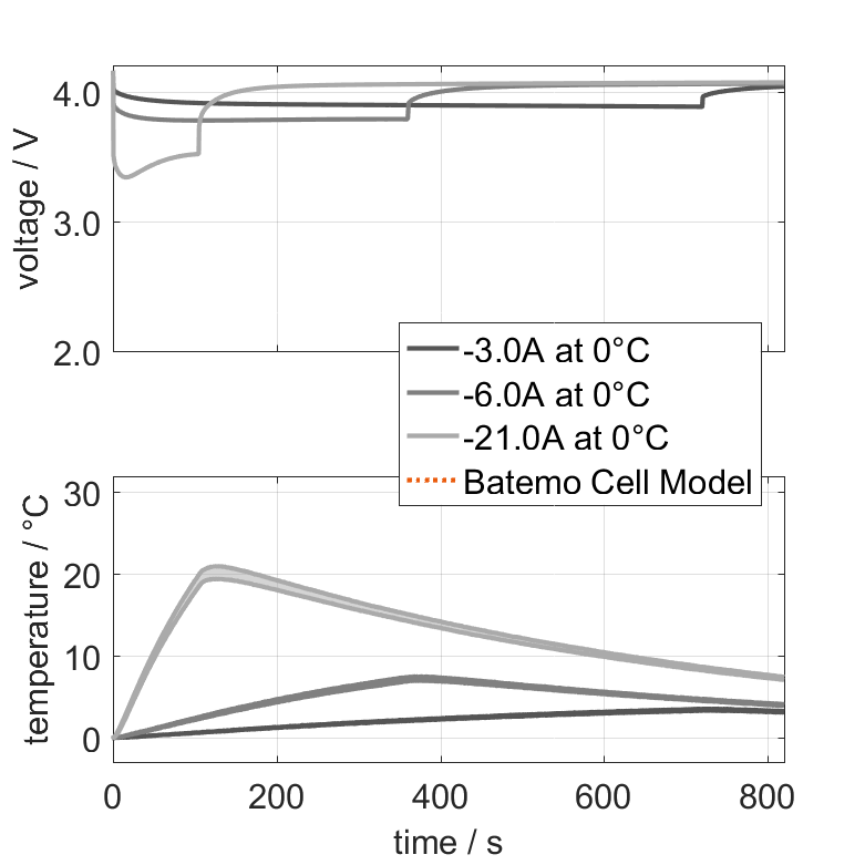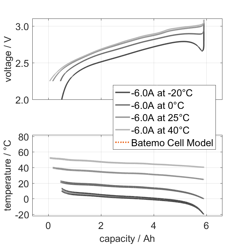 The Batemo Cell Model of the lithium-ion battery cell Reliance INR21700-RH60(B) is a high-precision, physical cell model with global validity. As a digital twin it seamlessly integrates into your research, development and battery analytics by basing your decisions on simulations. See the details to learn more about the features and capabilities of the Batemo Cell Model. Batemo demonstrates the accuracy and validity of the Batemo Cell Model by comparing battery simulation and measurement data in the range given below. Validation is extensive, experimental characterization covers the total operational area of the cell: At low and high temperatures, up to the maximal current and in the whole state of charge range.
