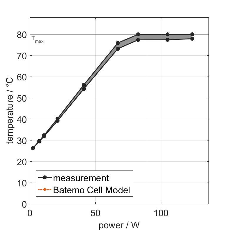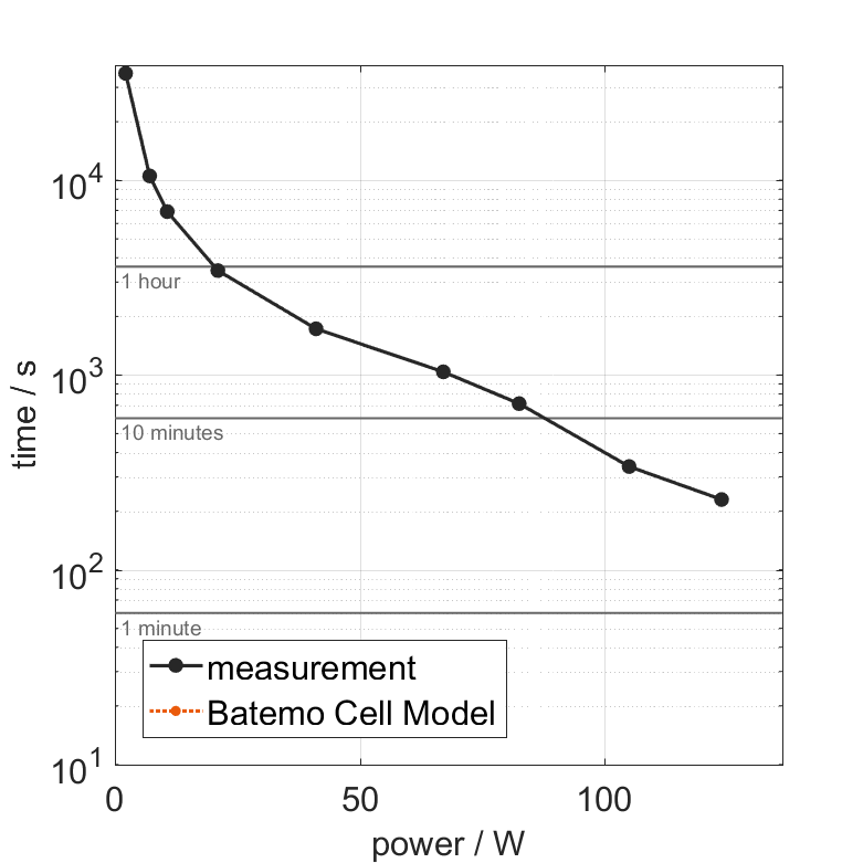 All quantities are measurement results from the Batemo battery laboratory. The continuous power is the highest power that completely discharges the cell without overheating it. Therefore, the cell is discharged from 100% state of charge (SOC) at an ambient temperature of 25°C with a constant current until a residual state of charge of 10% and either the lower voltage limit of 2V or 90% of the maximum surface temperature ( 72°C) is reached. The peak power is the power the cell can supply for 5 minutes. The cell is therefore discharged from 100% SOC at an ambient temperature of 25°C with a constant current until it reaches either the lower voltage limit of 2V or the maximum surface temperature of 80°C after 5 minutes. For cells that reach the maximum temperature limit, the measured power is directly taken as peak power. For cells that do not reach the maximum surface temperature after 5 minutes because they reach the lower voltage limit first, the measured power is multiplied by a correction factor that estimates the power that would have heated the cell to the maximum surface temperature within 5 minutes. The thermal boundary condition is free convection. These operating conditions may be outside the cell manufacturer’s specification. |