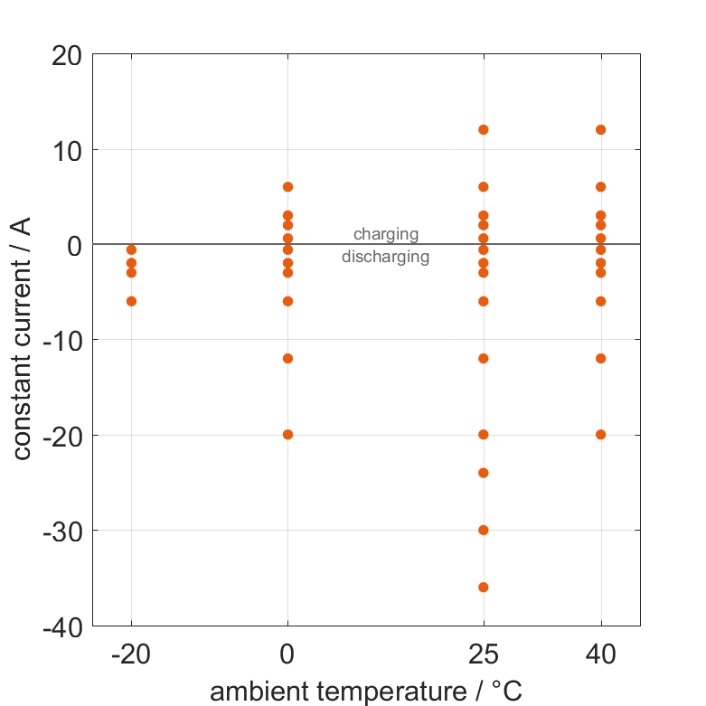 The cell is discharged from 100% SOC or charged from 0% SOC with different constant currents at different ambient temperatures. The thermal boundary condition is free convection. The measurement stops when reaching either the voltage of 2V or 4.2V or the surface temperature of 80°C. The graph shows for which ambient temperatures and charging and discharging constant currents measurements are available.